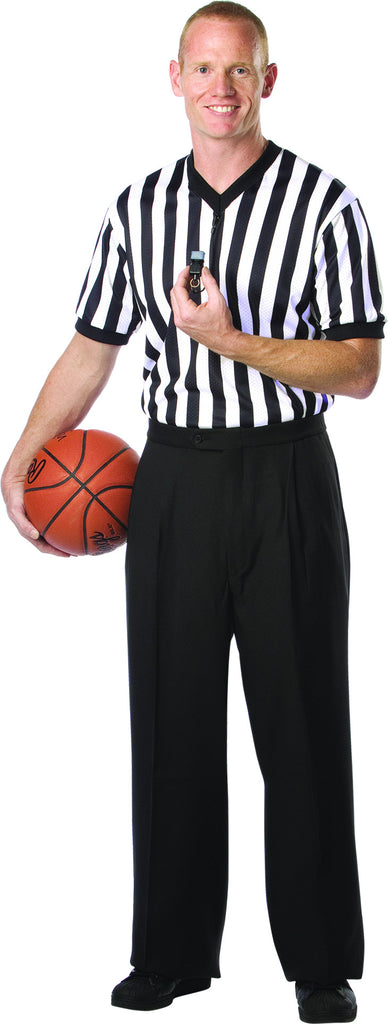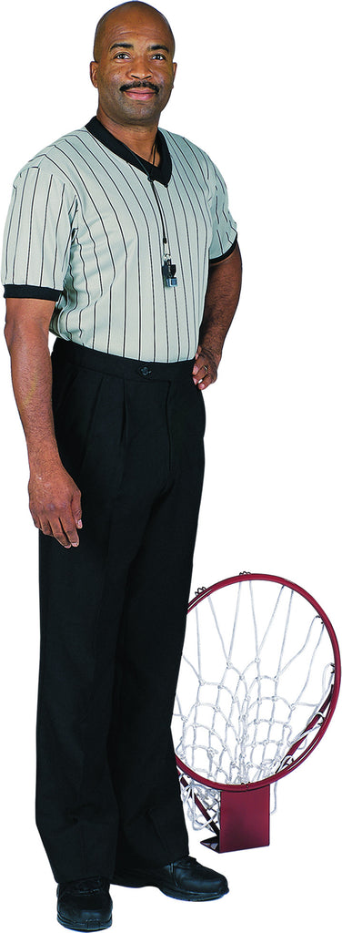 Made with high end quality materials this basketball official's pant will stand up to wear and tear on the court season after season. Made of soft lightweight Dacron polyester for maximum comfort and wrinkle resistance this pant is durable and can be machine washed. Features include a pleated front with side opening pockets, tab waist detail, and a wide non-roll waistband. Bottom opening is un-hemmed so it can be tailored to your height. Can be used for both basketball referees and coaching. Black.